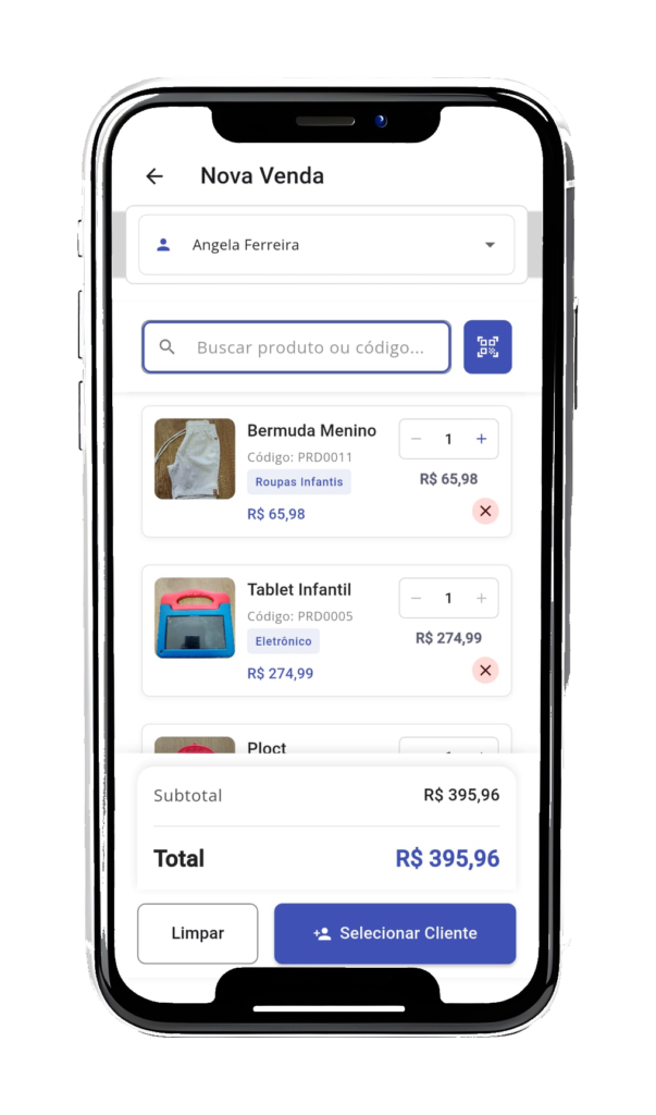 Processo de vendas ágil e intuitivo, permitindo selecionar ou cadastrar produtos, clientes e vendedor diretamente no momento da venda. Tudo pensado para tornar a operação rápida e eficiente.