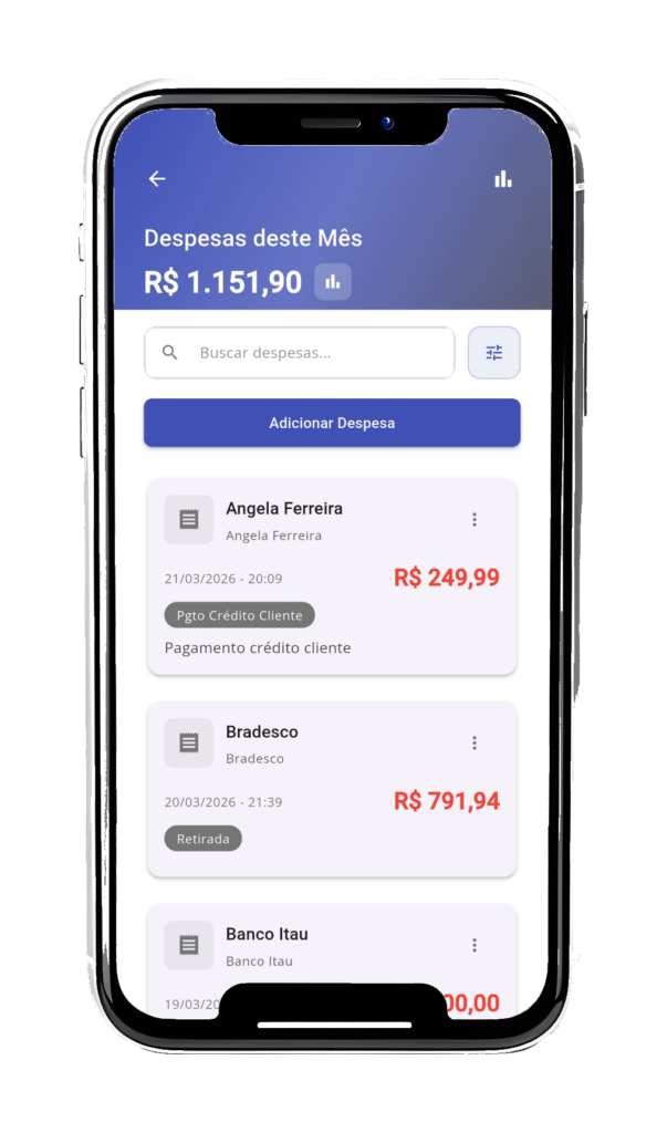 Registro simples e rápido das despesas diárias, com possibilidade de anexar fotos dos comprovantes. As despesas são automaticamente integradas ao Movimento Diário, garantindo controle financeiro preciso.