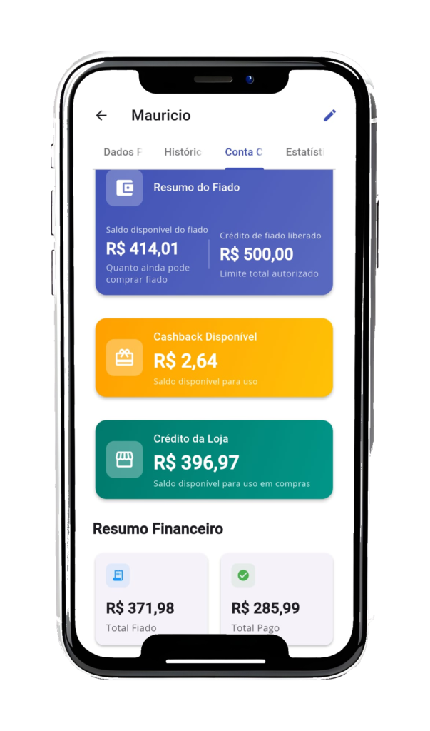 Permite definir limites de crédito para cada cliente, utilizados diretamente na venda. O sistema controla saldos, pagamentos e histórico, garantindo segurança e clareza no processo.